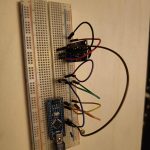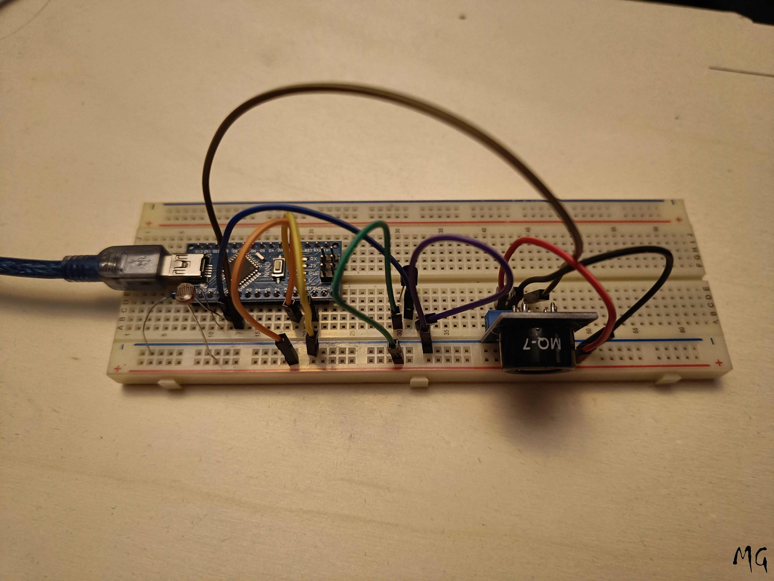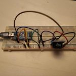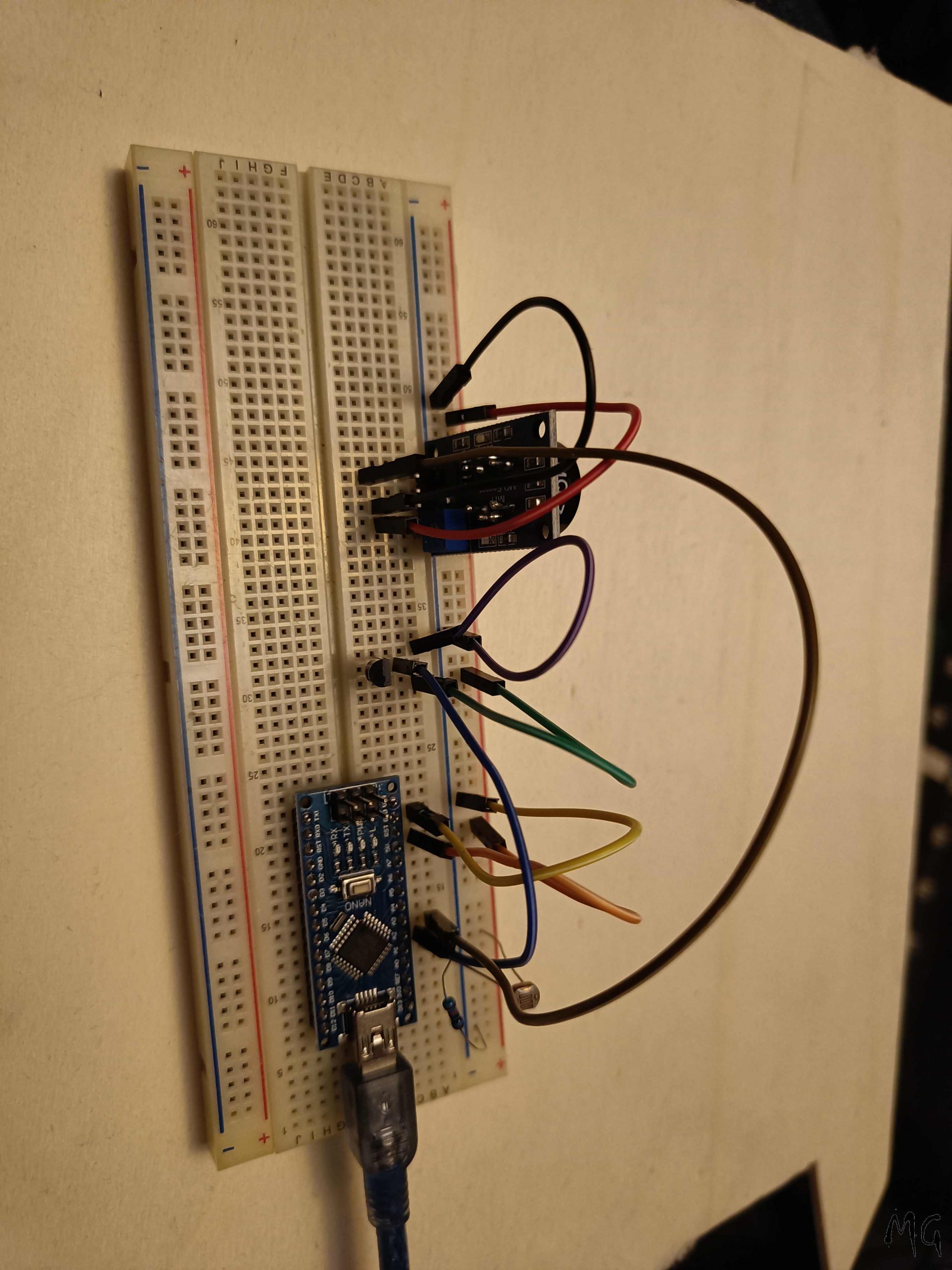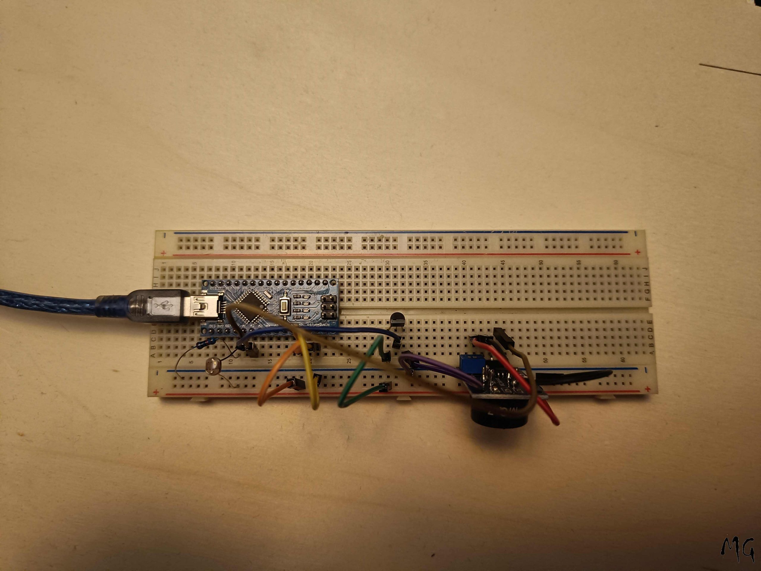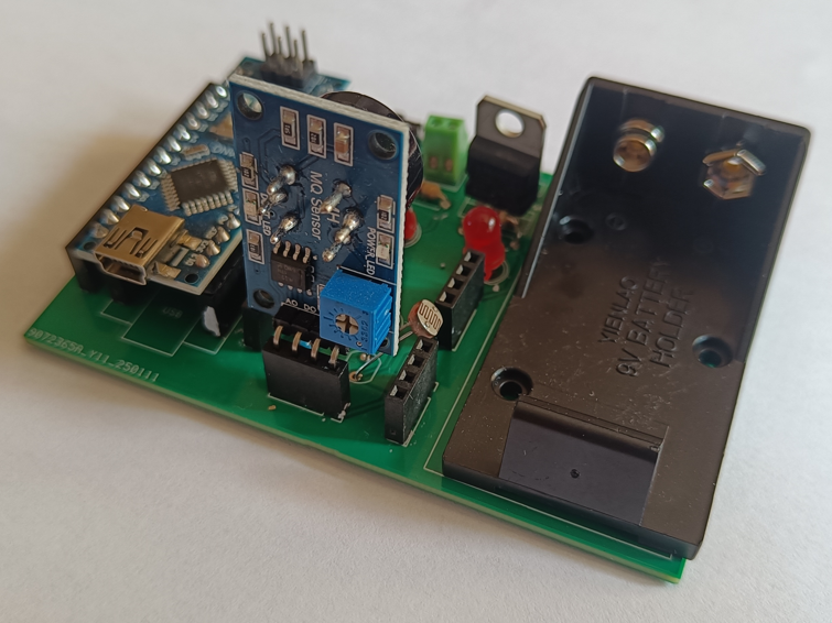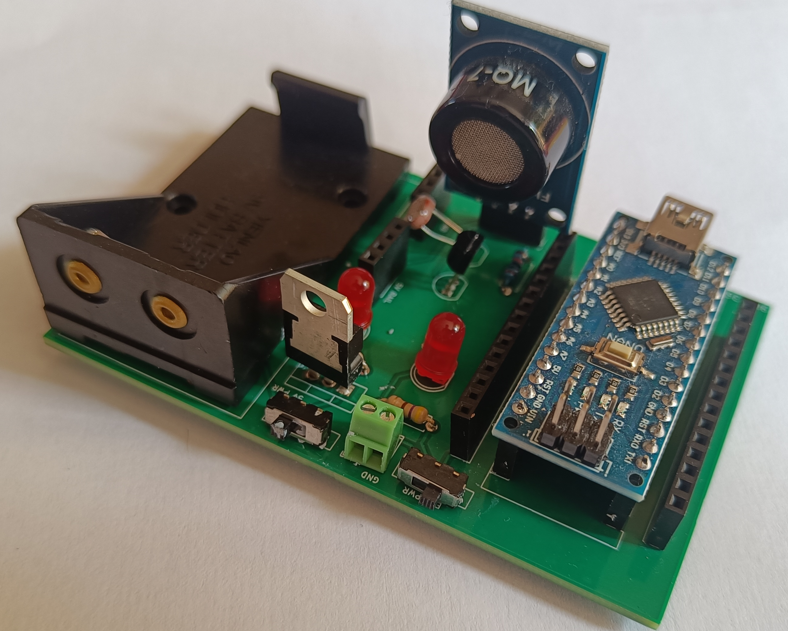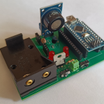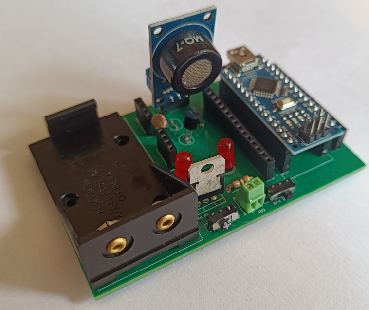 The initial design was created on a Breadboard / Prototyping board to prove the concept, during this testing, it was noted that because the MQ-7 has a high enough current draw that although it could be powered directly from the Arduino, it would affect the measurements of the other sensor. (see photos below). On the PCB design, it will need its own 5v supply.