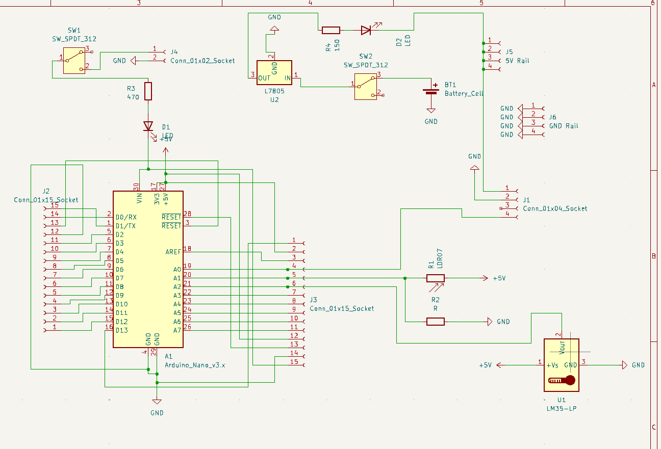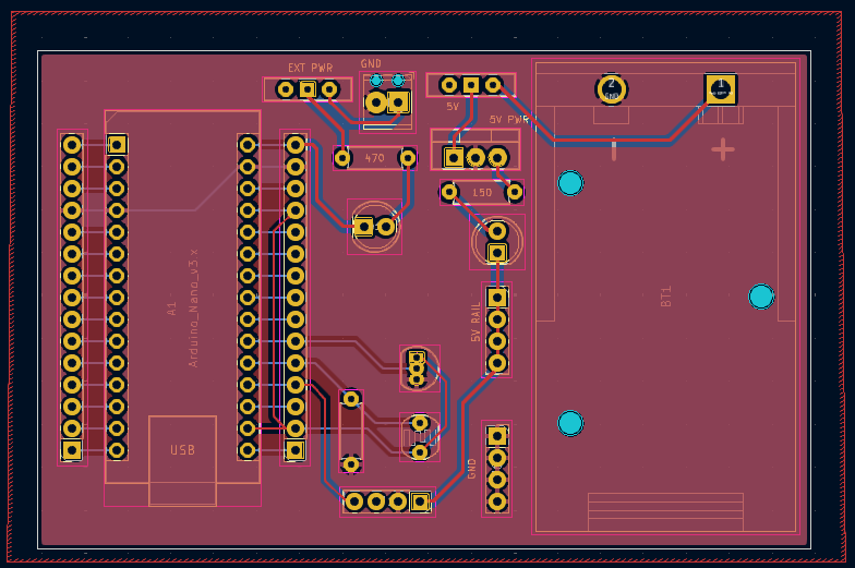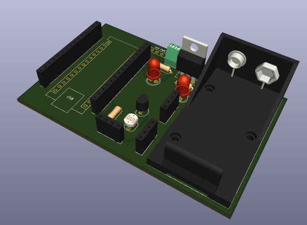 Using Kicad, i designed a PCB to have all of these sensors in situ, so not to waste the rest of the pins, additional headers were added so the other PINS could be used in the future, as well as adding 5v and GND rails.