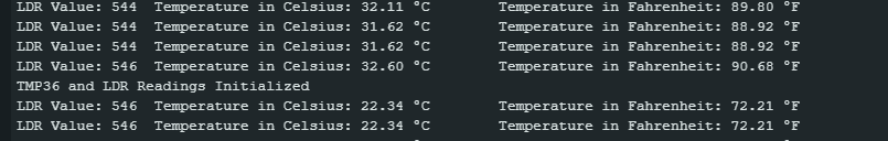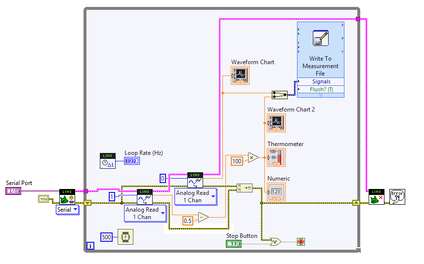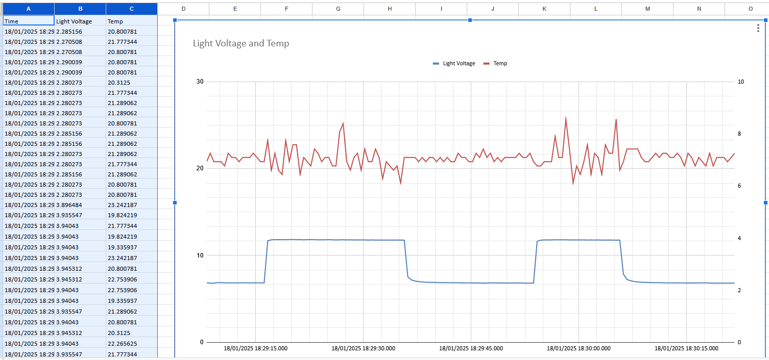 Below are a few imges of the Labview Program running with 2 senors and writing to a file. You will notice that the temp sensor becomes more irratic when there is high voltage on the light sensor, this could be because of a limitation of the arduino or how labview runs the program and reading the sensors sequentially.