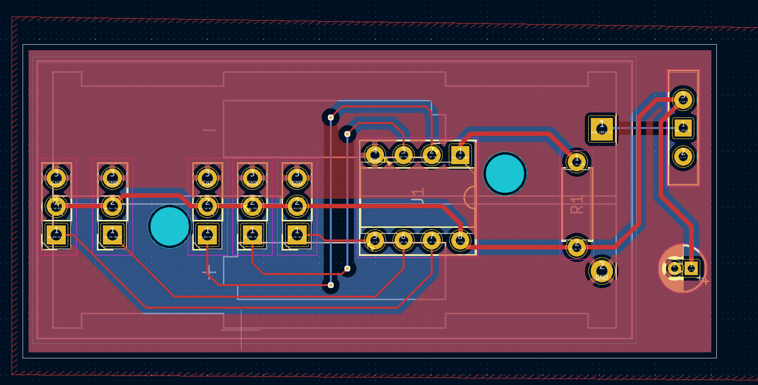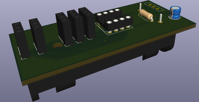 This was a design to have easily connectable headers to be able to connect to an AT Tiny, such as the 45 or 85.  This is a 2 layer board, that fits well with a 2 AA Battery holder to allow the project to run stand alone as the microchip can run at 3V.  The Battery holder is on the opposite side of the board to make the footprint as small as possible. This design also use vias to allow for tracks to change layers.