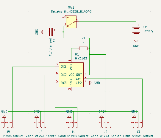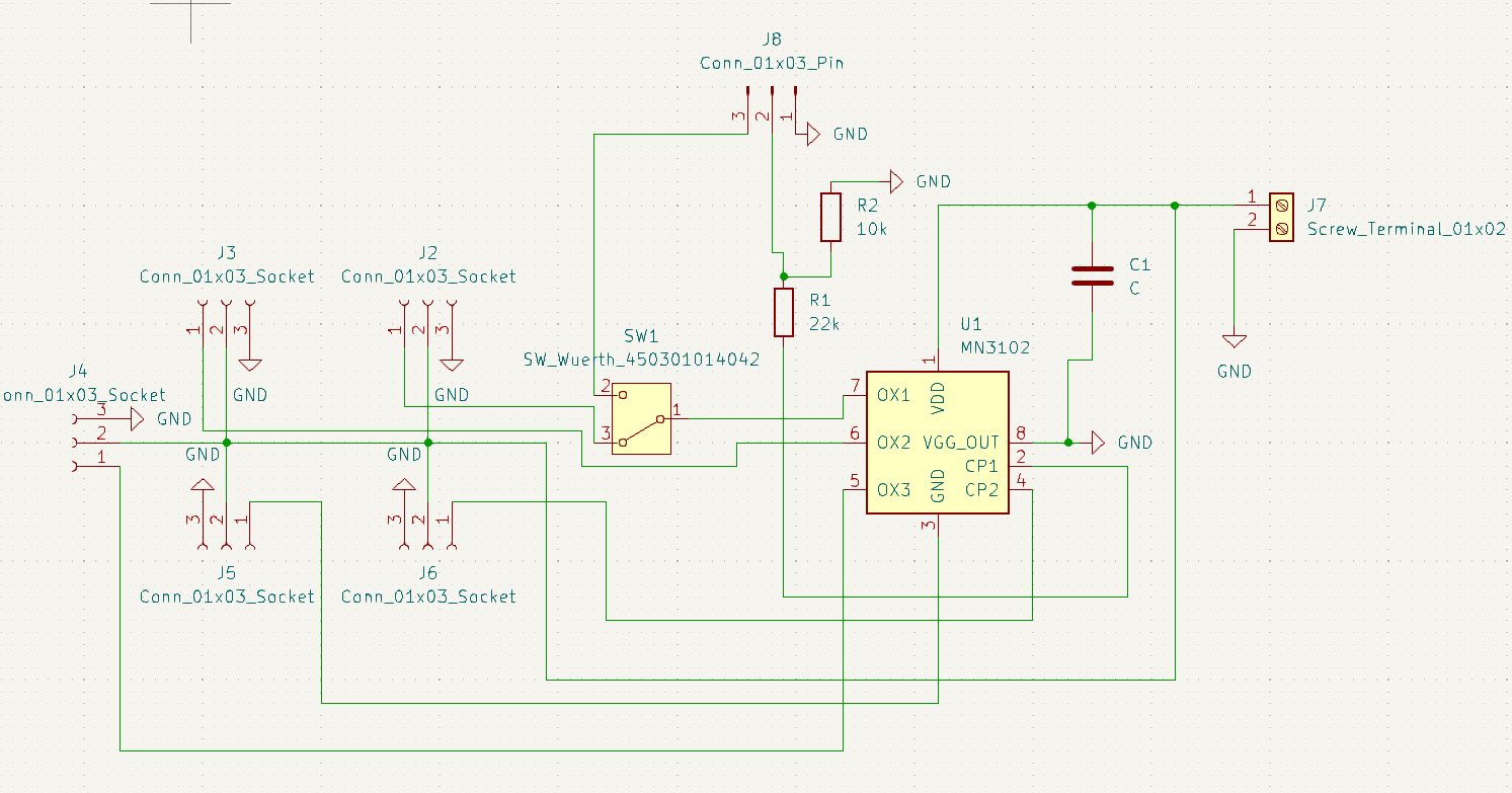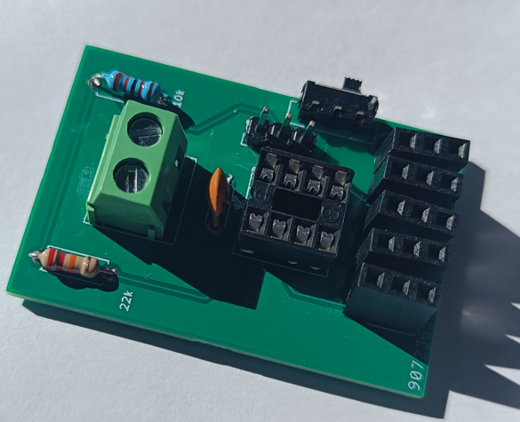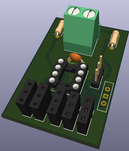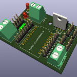 This was my first PCB Design, using the schematic given in there datasheets, i created a prototyping board, that had PCB Sockets for each pin out.  There is a switch to allow one of the pins to change from a programming Pin (in) to a Pin (Out).  This is a 1 layer board, all of the + and – pins are common.