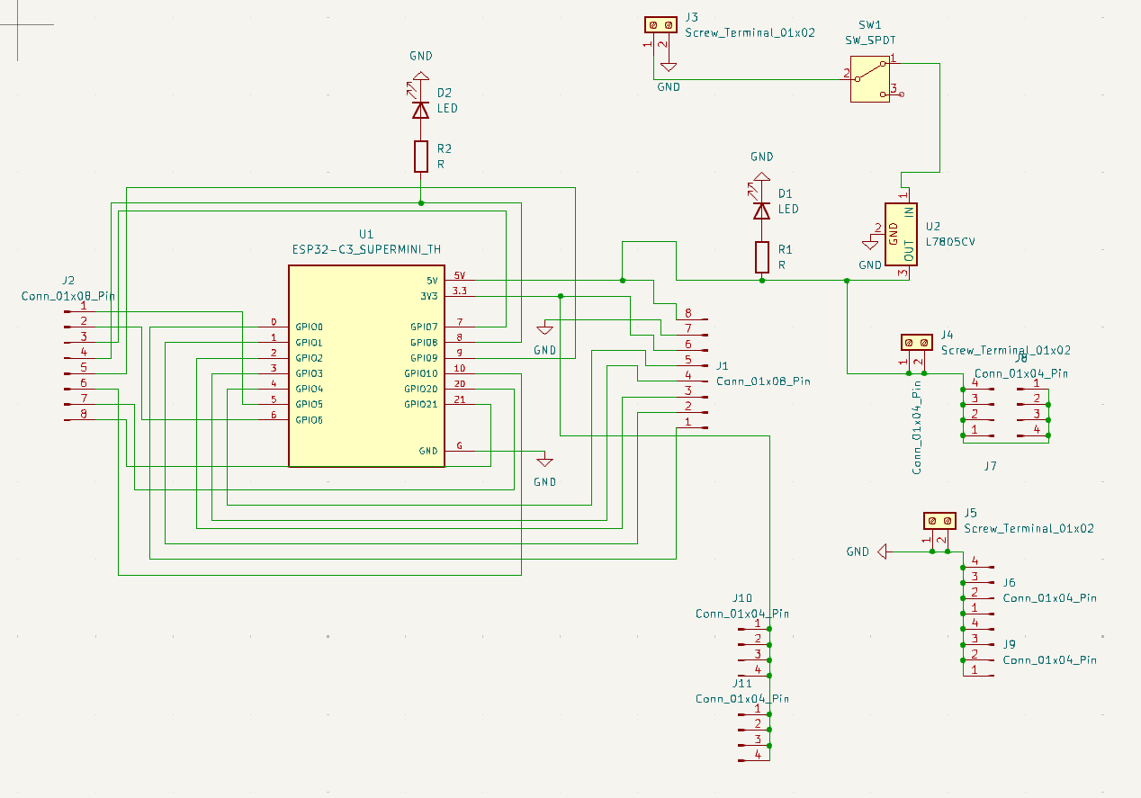 – 5v regulator, not only for the ESP32 but as a supply for connected components such as sensors.